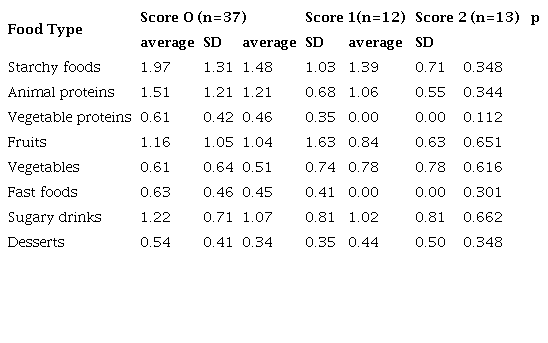 An association was found between being overweight and the presence of dental calculus (p=0.038). However, according to the other variables analyzed, no statistically significant associations were found between the frequency of consumption of starchy foods, animal proteins, vegetable proteins, fruits, fast foods and desserts with plaque index, calculus or gingivitis. It was found that body mass index for boys was 20.21 and for girls 20.11, no statistically significant differences were found between gender.