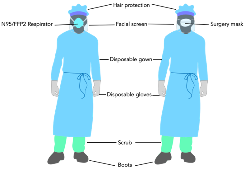 Personnel in close contact with patients should wear the appropriate personal protective equipment (PPE): scrub, disposable coat, gloves, eye protection (screen/safety glasses), hair protection, disposable boots, and N95/FFP respirators or a combination of a surgical mask with face shield (23).