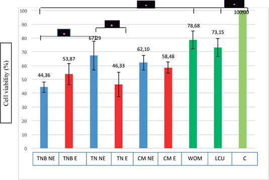 All experimental groups showed a statistically significant cytotoxicity (p<0.05) when compared with the negative control group (C). A statistically significant difference was found between the TNB NE group and WOM, LCU, and C groups (p<0.05). When the positive control groups (WOM and LCU) and negative control group (C) were compared to each other, a significant difference was shown between the LCU and C groups (p<0.05). No significant difference was observed between the WOM and LCU groups or WOM and C groups (p>0.05) (Figure 1).