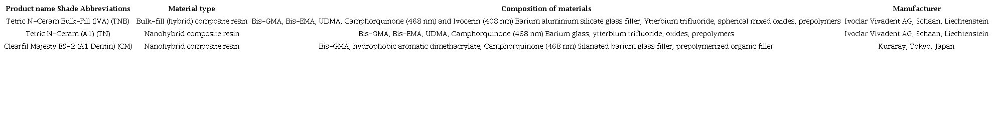 In this in vitro study, expired (six months) and non-expired composite resin materials were used (Tetric N-Ceram Bulk-Fill (IVA) Ivoclar Vivadent (TNB), Tetric N-Ceram (A1) Ivoclar Vivadent (TN), and Clearfil Majesty ES-2 (A1 Dentin; CM) (Table 1).