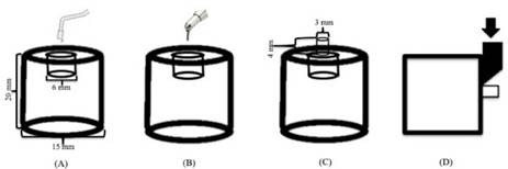 Group C: C (DMG, Germany) was injected to the polyethylene mold (inner diameter, 3mm; height, 4mm) incrementally in two layers measuring not more than 2mm. Each layers of C were dispensed to the surface for 25 s using the dispensing tip provided by the manufacturer and light polymerized (at 800 mW/cm², Elipar Trilight, 3M ESPE, Seefeld, Germany) for 20s. A distance of 2mm (9) between each layers of C and light-tip was provided; a glass plate (2mm in thickness) was placed on top, before light polymerization of the last layer of C for the same purpose. After light polymerization of the last layer of C, polyethylene moulds were removed gently from the specimens.