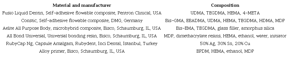 Two commercially available self-adhesive composites, a universal bonding (UB) material, a universal composite (UC) material, amalgam and AP were used in the present study. The brand names, manufacturers and chemical compositions of the materials are listed in Table 1.