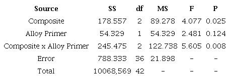 In the present study, calculated SBS values for APControl were slightly lower than a previous finding (22.60 ± 4.30) (9); but considerably higher than another finding (4.40 ± 2.00) (6). Different types of amalgam materials were used in those studies. According to Ozcan et al. (6), the type of amalgam may influence the results.