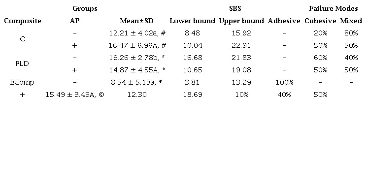 The minimum accepted SBS value between resin-based materials and substrate is 5 MPa according to ISO 10477 (29). In the present study, the SBS values were higher than 5 MPa for all of the investigated groups, despite the lower bound value was 3.81 MPa for Group Control.