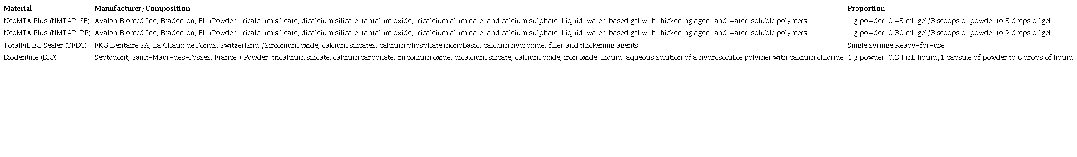The endodontic materials used in this study and their respective composition, proportion, and manufacturers are described in Table 1.
