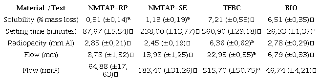 Setting time, solubility, radiopacity and flow are described in Table 2. All the materials had significant differences regarding the setting time. NMTAP-SE and NMTAP-RP showed greater setting time than BIO and lower than TFBC (P<0.05). Regarding solubility, NMTAP-SE and NMTAP-RP had the lowest values, with no difference between the two consistencies (P>0.05). BIO and TFBC had solubility higher than the recommended by ISO 6876 (P>0.05). TFBC presented the highest radiopacity (P<0.05). There was no difference between the other materials (P>0.05). When evaluating flow, TFBC had the highest values, followed by NMTAP SE, NMTAP RP and BIO (P<0.05).