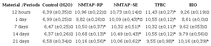 The pH values in the different periods are shown in Table 3. All the cements had alkaline pH after 12 hours. TFBC presented the highest pH values (P<0.05), followed by NMTP-RP and NMTAP-SE (P>0.05). BIO had the lowest values after 12 hours, 1, 7 and 14 days, with higher values than the control group (distilled and deionized water) (P< 0.05). After 7 and 14 days there was no statistical difference among NMTAP-RP, NMTAP- SE and TFBC (P>0.05). After 21 days there was no difference among groups (P>0.05).