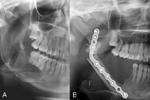 Our treatment plans depended on the patient’s history, radiographic examinations including panoramic X-ray or computed tomography (CT), and histopathological findings of the lesions. We performed radical treatments such as marginal or segmental resection with a safety margin of at least 1 cm beyond the radiographically visible margins in these patients and evaluated their efficacy for recurrence. The lesion-related soft tissues were excised. Reconstruction of cases was performed in same surgical procedure with anterior iliac bone graft, vascularized fibula graft, TMJ prosthesis or a reconstruction plate alone. All patients were followed clinically and radiographically by periapical and panoramic X-ray. If doubt of recurrence existed, a dental scan computer tomography was performed. Periodic follow-up examinations were performed every 6 months for the first 2 years and every 12 months for the following years.