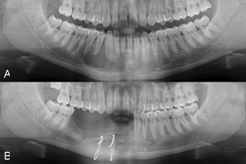 Odontogenic keratocyst is a benign, intraosseous neoplasm with aggressive and infiltrative characteristics that originates from the remnants of the dental lamina (1,2). It has a characteristic lining of parakeratinized stratified squamous epithelium. The lesion was first described in 1956 as an odontogenic keratocyst to indicate the keratinization of the epithelial lining (3,4). The recurrence rate after removal of the lesion is very high (5,6). Recurrence rate and morbidity highly associated with treatment modality, and the most appropriate treatment method has been controversial (4,5). Treatment modalities in the literature include decompression, marsupialization, curettage, enucleation, and more invasive methods, such as radical enucleation and resection (1,2,7).