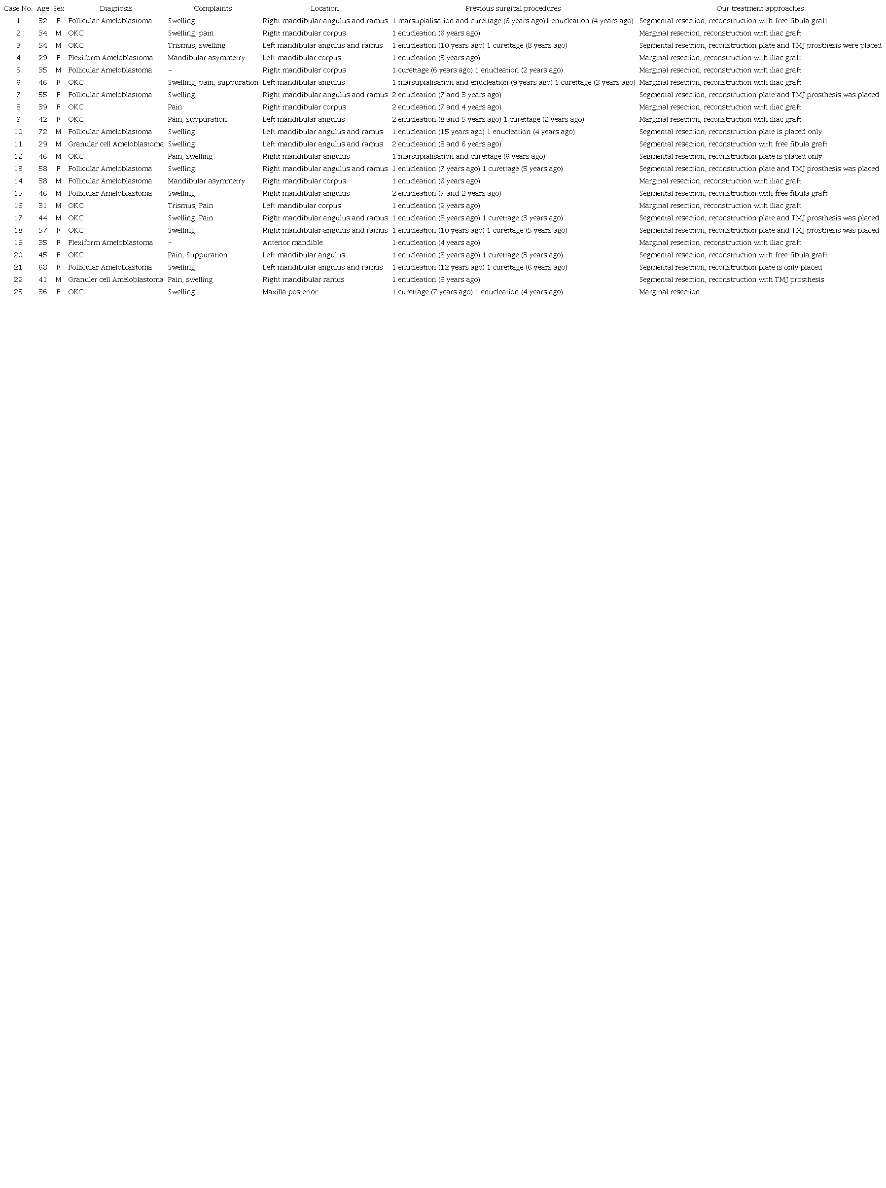 In the 11-year period studied, eleven recurrent OKC cases and twelve recurrent ameloblastoma cases were operated. Patients’ age, type of lesion, previous surgeries, and our treatment modality are shown in Table 1. Patient ages ranged from 29 to 72 years (mean=44 ± 11.91 years). Most patients were referred to our department with complaints such as gradually growing mass, mandibular asymmetry, swelling, pain, trismus, or suppuration. Two patients had no complaint, but recurrences were diagnosed incidentally by routine radiography. The patients’ prior treatments were marsupialization, enucleation, curettage or their combinations.