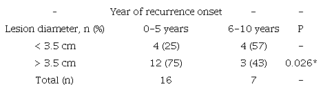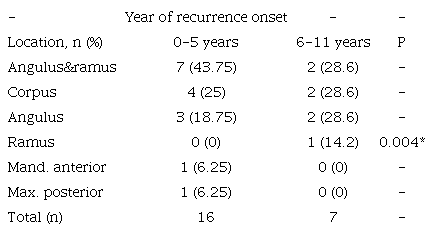 Recurrence occurred within 5 years after the first treatment in 69.5% (16/23) of patients. In seven cases (31.5%), recurrence occurred between 6 and 11 years after the first treatment. The mean recurrence time was 4.2 years (range 3-11 years). There is a higher incidence of recurrence in the mandible (22/23) as compared to the maxilla (1/23), among which 9 were in the angle and ramus region, 6 were in corpus region, 5 were in angle region, 1 was in anterior region and 1 was in ramus region. There was statically significant relation between location and year of recurrence onset (p=0.004; Table 2). One recurrence in 7 cases, two recurrence in 15 cases, and three recurrence in 1 case were recorded. The majority of lesions (15/23, 65%) were greater tan 3.5 cm (mean, 4.3 cm, range, 2.5-7 cm). There was statically significant relation between diameter of lesion and year of recurrence onset (p=0.026; Table 3). Among the first treatments, enucleation exhibited most high recurrence rate (18/23; 78%). Marsupialization with curettage, marsupialization with enucleation, and curettage had similar recurrence rates, with respective values of 0.9% (2/23), 0.4% (1/23), and 0.9% (2/23).