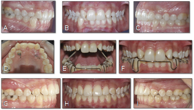 All PDCs were surgically exposed and a closed eruption technique was performed, which involved a flap raised to expose the palatal surface of the canine crown, and removal of sufficient bone surrounding the canine tooth. A bonded button was attached with a 0.010" ligature wire onto the exposed tooth, and the flap was replaced and sutured. A light force (80-100 gr) was applied in vertical or distovertical direction by using orthodontic elastics attached to a lower removable appliance which provided anchorage and bite jumping (Figure 1a-i). The elastic traction continued until the canine erupted into the oral cavity. The participants were asked to use their intraoral elastics minimum 16-18 hours a day and note the daily usage. The notes of the patients were controlled in every appointment. When a patient missed an appointment; a new appointment was arranged as soon as possible. When the patient missed two ensuing appointments, he/ she excluded from the study. Fixed orthodontic appliances (Roth system, 0.018" slot; Omniarch, Dentsply GAC, USA) were applied to the maxillary dentition, for both groups. The upper arch was aligned using 0.014-0.018" round NiTi wires, followed by 0.016×0.022 and 0.017×0.025” NiTi rectangular archwires, respectively. The lower arch was bonded following the eruption of the canine into the cavity, and the final alignment of all teeth was achieved. A periodontal evaluation was performed following the debonding procedure. Treatment duration was measured in months and calculated as the time spent from the rising of the flap to reach to the impacted canine and first orthodontic force application to the alignment of the PDC into the dental arch (this point is defined as the application of 0.014 NiTi wires to the upper arch including the PDCs). Total duration of the fixed orthodontic treatment was not calculated to eliminate the effects of other teeth arrangements following canine alignment.
