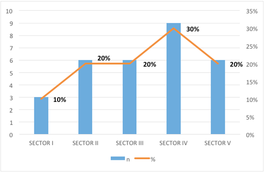 Twenty-three patients who were identified with a PDC that required an orthodontic-surgical treatment approach comprised the PDC group (21 female, 2 male). A total of 30 PDCs were involved in this group (16 unilateral, 7 bilateral). This prospective study revealed that the prevalence rate of PDC was 5% of the orthodontic patient population within 2 years. The male:female ratio was 1:10.5 in the PDC group. This group exhibited 2.3 times more frequent unilateral impactions than bilateral occurrence. Right-left distribution of the unilateral impactions was almost equal (right: 9, left: 7). Table 1 presents the descriptive statistics of the parameters for the PDC and Class I control groups. The distribution of the PDCs according to the sector (Figure 4) demonstrated the PDCs were mostly located (30%) in sector III.