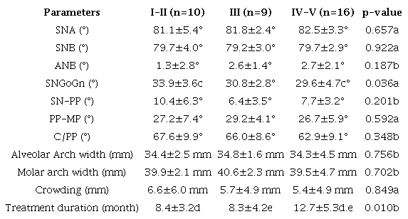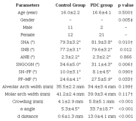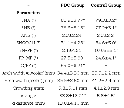 A comparison of the mean values of the parameters showed statistically significant differences in certain characteristics. The PDC group had greater SNA° (p<0.01), SNB° (p<0.05), and PP-MP° (p<0.05) angles and a smaller SN- GoGn° angle (p<0.01) compared with the Class I control group. Also, Class I control group had smaller arch length discrepancies, α angle, and d distance (p<0.001) while both the alveolar and molar arch widths and SN-PP° angle were similar between the groups (Table 2).