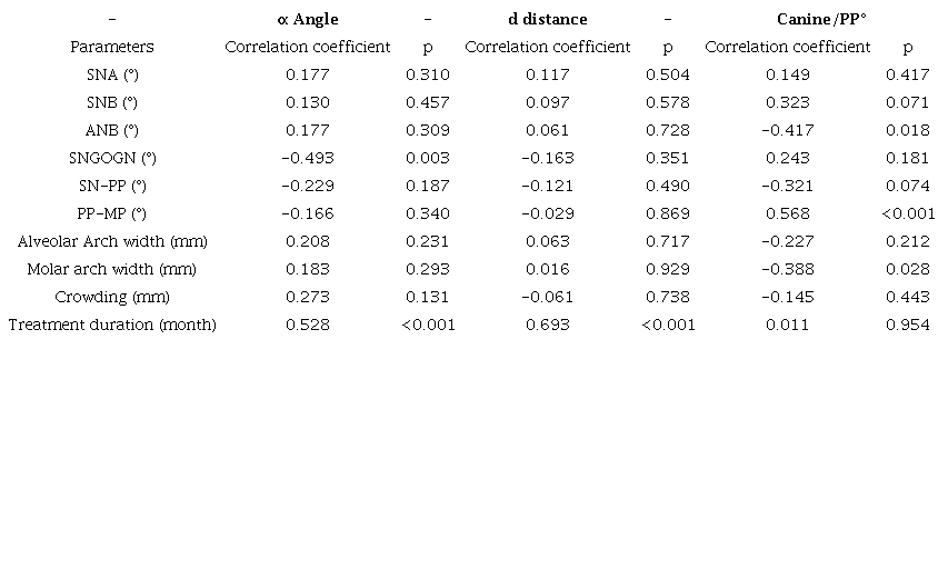 When relationships between α angle and all other cephalometric and dental parameters were investigated, no correlation was found, except the SN-GoGn° angle. This angle showed a negative correlation with the angulation of the PDC (p<0.01). Treatment duration was also positively correlated with α angle (p<0.001). There was no correlation between d distance and other parameters. However, d distance was positively correlated with treatment duration (p<0.001). Canine inclination on the sagittal plane (C-PP°) was negatively correlated with intermolar arch width and ANB° (p<0.05) but not associated with the treatment duration (Table 4).