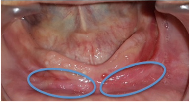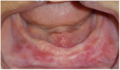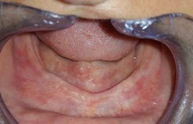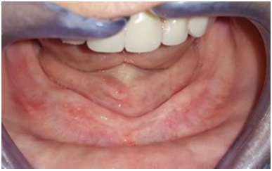 A female patient aged about forty-five, in good health, attended the consultation at Rabat Dental Consultation and Treatment Center for the instability of her prosthesis, especially the mandibular one. During the interrogation, the patient stated that she had worn the prosthesis for five years without any prosthetic control, and that a mandibular tissue lesion appeared a year ago.
