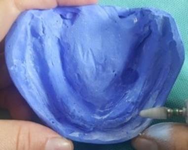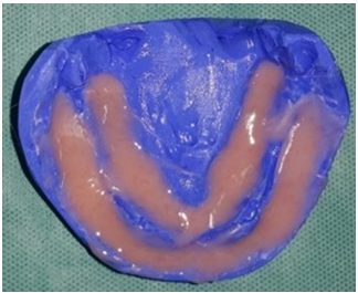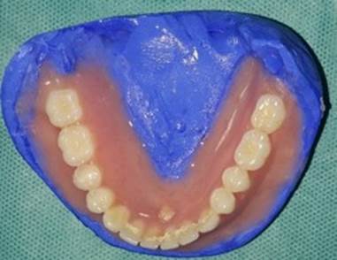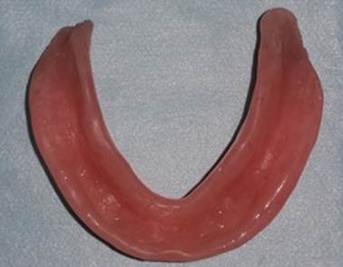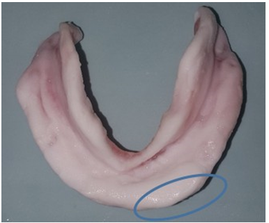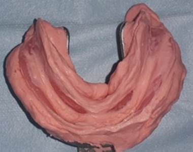 We started with the placement of a fluid alginate at the intaglio, next to the lesion and between the ridge and the lesion. Then, before the setting of the material, we took an alginate impression with a commercial tray with the prosthesis in place (Fig.2). The casting of the impression was carried out. On the model we eliminate the epulis fissuratum so as to simulate the final result obtained by the surgery. After the insulation of the model (Fig. 3), we put the acrylic resin with a consistency neither too fluid nor harsh in the vestibule and the alveololingual groove and in the intaglio of the prosthesis after painting it with the monomer to improve the adhesion between the two resins (Fig. 4). The areas of the intaglio that weren’t covered by the alginate during the impression, served as stops for the prosthesis and so facilitated its good repositioning on the model (Fig. 5). After the polymerization, removal of excess and finishing of the prosthesis was performed (Fig. 6).