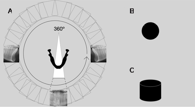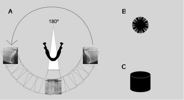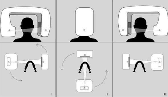 Algunos equipos de CBCT permiten una rotación parcial (180º) o total (360º) alrededor del paciente, lo que influye directamente en la dosis absorbida por los tejidos expuestos. Así, cuanto mayor sea el ángulo de rotación, mayor será la dosis administrada. Esto permite al radiólogo escoger el ángulo de rotación que ofrezca una imagen de calidad diagnóstica mientras se disminuye la dosis al paciente, ya que el ángulo de rotación también influye en la calidad de la imagen debido a la cantidad de imágenes base disponibles (Figura 3 y Figura 4) (10).