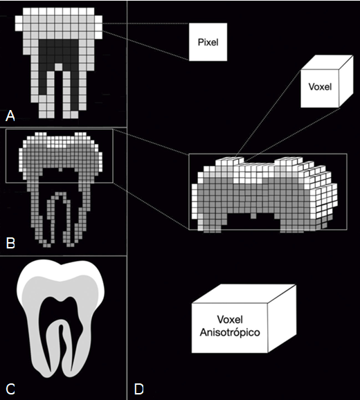 Durante una exposición de CBCT, el tubo de rayos X y el detector giran a lo largo de una trayectoria circular, cuyo eje de rotación es la región de interés (ROI-region of interest). El haz de rayos X en forma de cono o pirámide, dependiendo de la forma de los colimadores, produce varios cientos de proyecciones de rayos X bidimensionales (imágenes crudas) que son adquiridas por el detector. Estas sufren varios pasos de preprocesamiento para eliminar aberraciones asociadas con variaciones en el detector por ganancia y defectos de píxeles. Luego, dichas proyecciones son reconstruidas en una representación tridimensional del objeto escaneado que representa la atenuación relativa del haz de rayos X de los diferentes materiales en el objeto. En la CBCT, el objeto escaneado se reconstruye como una matriz 3D de pequeños cubos de información, denominados vóxeles. Estos generalmente son isotrópicos, es decir, todos sus lados tienen la misma medida, y cada uno tiene asignado a un valor gris que depende de la atenuación del material representado en su interior. Entre más pequeño sea el vóxel, mayor será la resolución de la tomografía (Figura 2). En general, la reconstrucción de imágenes se puede agrupar en tres categorías: proyección posterior filtrada (FBP-filtered back projection), técnicas de reconstrucción algebraica (ART-algebraic reconstruction techniques) y métodos estadísticos. La forma más extendida de reconstrucción FBP utilizada en CBCT utiliza el algoritmo Feldkamp- Davis-Kress (FDK), que se utiliza en casi todas las máquinas CBCT debido a su simplicidad y tiempos de reconstrucción rápidos (7).