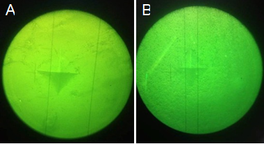 Al cabo de cinco días se realizó la medición de la microdureza superficial final de los 40 bloques de resinas acrílicas que fueron sumergidos en la bebida carbonatada y agua destilada, grupo experimental y grupo control respectivamente, utilizando el mismo microdurómetro, aplicando la misma carga, el mismo número de indentaciones y el mismo tiempo. Con la ayuda del microscopio electrónico del equipo para ensayos de Dureza Vickers se tomó fotografías de las indentaciones realizadas en ambos materiales. Los datos de microdureza se registraron mediante una ficha de recolección de datos (Figura 1).