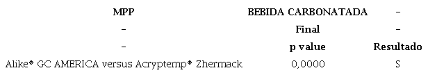 Finalmente, se comparó la microdureza superficial de las dos resinas acrílicas utilizadas en este ensayo después de ser expuestas a una bebida carbonatada, obteniendo medias de 10,8HV y 8HV para Alike-PMMA y Acrytemp- resina bisacrílica respectivamente, donde se aplicó la prueba paramétrica de t student, obteniendo un valor p=0,0000 (t Student), encontrando una diferencia estadísticamente significativa en el resultado de estos dos materiales (Tabla 2).