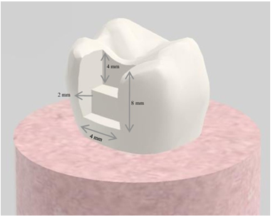Fifty non-carious third molars with a buccolingual width of 10.5 (±0.5) mm were used for the study. The teeth were stored in 0.5% chloramine solution at + 4°C for no longer than one month until the study started. Dental surfaces were examined with a stereomicroscope (Nikon, Tokyo, Japan) at ×2 magnification to ensure no caries or intrinsic discoloration. Standard class II cavities were prepared using a flat-ended diamond fissure bur (6837-016) underwater cooling with a high-speed rotating tool. Cavity preparation was schematized in Figure 1. A new bur was used for each cavity. The inner edges of the cavities were rounded to reduce the C factor, and dimensions were confirmed with the aid of a periodontal probe. A single operator prepared all cavities, and another researcher confirmed the pre-restoration preparation parameters to ensure continuity and accuracy.