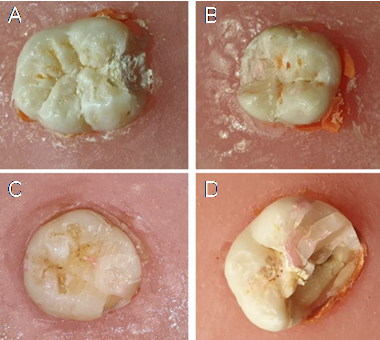 All specimens were evaluated to determine failure mode, and this failure was classified as mode I (fracture in restorative material), mode II (fracture in tooth and restoration), mode III (fracture of one cusp, intact restoration), and mode IV (longitudinal fracture, unrestorable), (Figure 2).