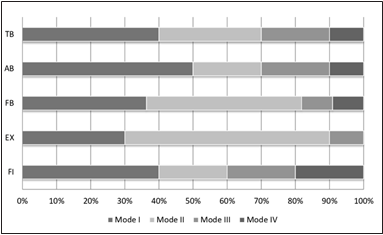 The percentage of failure modes were presented in Figure 3. Mode I and mode II failure types were predominant in all groups. Additionally, mode IV failure had never seen in the EX group.