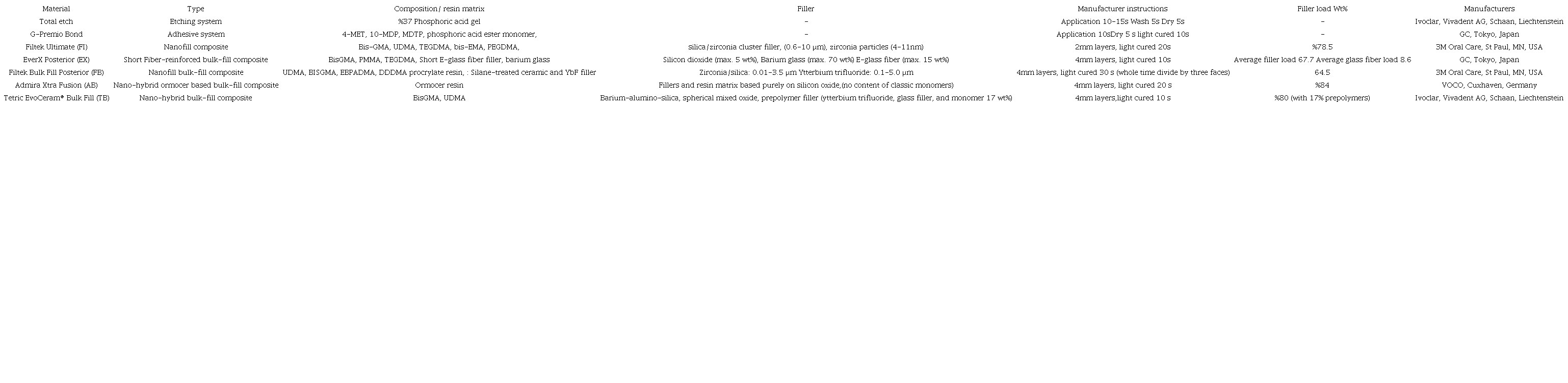 The properties and application steps of the materials used in the restoration procedure are given in Table 1. Before each restoration, 37% phosphoric acid etching gel (Total etch; Ivoclar, Vivadent AG, Schaan, Liechtenstein) was applied on enamel and subsequently on dentin; and allowed a reaction time of 15 seconds and then G-Premio Bond (GC, Tokyo, Japan) was applied to the cavity walls. After drying with low-pressure air spray, it was polymerized using a LED light source with 1000 mW/cm² standard power (Valo Cordless, Ultradent, South Jordan, UT, USA). A universal matrix band (Protect, Germany) was used to build up the proximal walls using the relevant composite resin of each group. The sample size was estimated based on a previous study conducted with Akbarian et al. (1). Samples were divided into 6 groups (n=10) according to the restorative material to be applied.