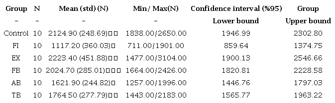 All analyses were performed using a statistical software package (SPSS, version 22.0, SPSS, Inc., Chicago, IL, USA). Data represented normal distribution according to both Kolmogorov- Smirnov and Shapiro-Wilk tests. Also, it was observed that the variances were homogeneous according to Levene Statistic (p=0,599 for based on mean). Therefore, one-way ANOVA and Post Hoc Tukey’s tests were used to determine the differences between the groups. Significance was set to <0.05.