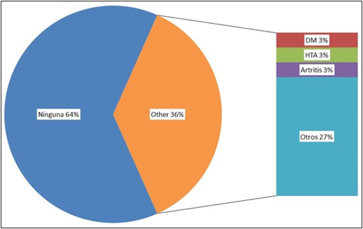 La Figura 1 presenta la distribución porcentual de los padecimientos metabólicos de los participantes. El 36% de los pacientes, presentaron enfermedades metabólicas crónicas, como Diabetes Mellitus tipo 2, hipertensión arterial o artritis reumatoidea.