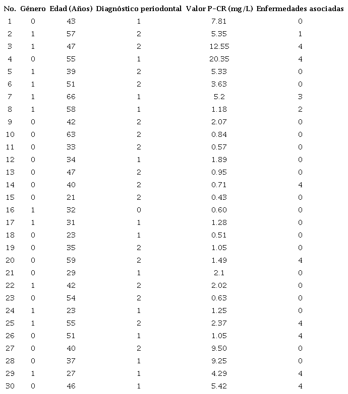 Se analizó la condición médica, dental y periodontal de 30 pacientes. Se procedió a establecer una codificación por conveniencia para cada variable, categorizando el género en cero para hombres y uno para mujeres; el diagnóstico periodontal en cero para gingivitis, uno para periodontitis crónica localizada y dos para periodontitis crónica generalizada; las enfermedades metabólicas asociadas en 0 para aquellos sin compromiso sistémico, uno para diabetes mellitus, dos para hipertensión arterial, tres para artritis reumatoide y cuatro para otras patologías; además, se incluyó la edad en años cumplidos de cada uno de los pacientes y el valor de P-CR (mg/L) reportado en el examen de laboratorio. En la Tabla 1 se presenta un resumen de los hallazgos encontrados.