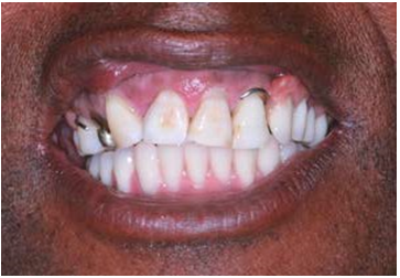 Clinically, the patient presented aesthetic and functional impairment and excessive exposure of the gingival tissue. The patient wore a removable partial denture that presented a mismatch, and only teeth #11, #12, #13, #14, #15 and #21 were present, with grade III mobility. The lower arch presented a fixed full arch hybrid prosthesis previously placed (Figure 1).