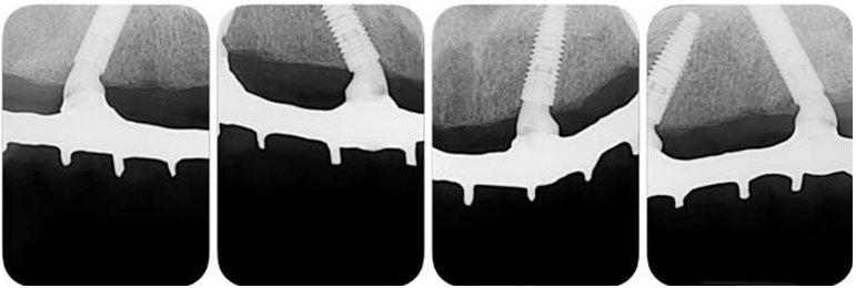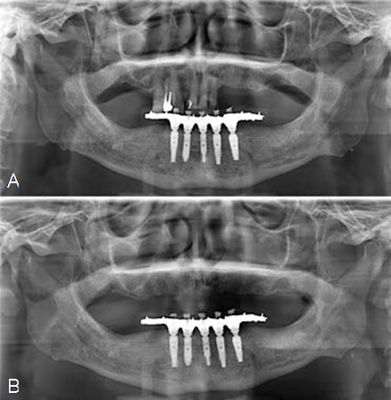 Extra-long implants placed tilted have been recommended to obtain high levels of primary stability in the upper jaw arch, avoiding bone graft procedures (18). From a biomechanical point of view, this situation can be extremely important (18). The tilted placement of the implants and the angled abutments provided the decrease in the length of the cantilevers in this case report, an important factor to avoid fractures of the metal bar (19). In addition, radiographic images have shown that the remodeling of the upper jaw bone around tilted implants is minimal (20).