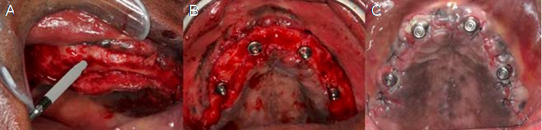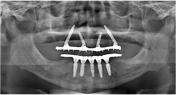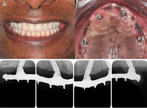 The treatment proposed by the team of professionals was the placement of two conventional-length implants in the anterior region and two distal tilted and nasal wall-directed extra- long implants to support a fixed full-arch hybrid prosthesis with immediate loading. The purpose of treatment in this case was to restore the patient's function and aesthetic appearance, in addition to reconstructing the occlusion with the reestablishment of the vertical dimension.