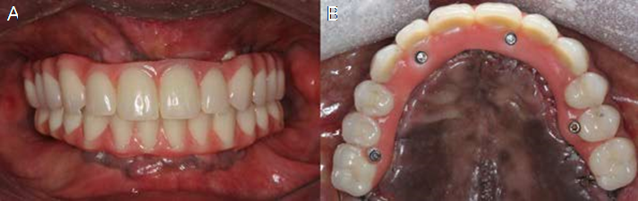 Forty-eight hours thereafter, the teeth were tried in, fixed with wax to the metal bar and on the third day the final prosthesis was inserted, according to the passive fit technique. Occlusal adjustments were performed, relieving excessive contact in excursive movements during the osseointegration period, but keeping the prosthesis in occlusion (Figure 4.A, Figure 4.B and Figure 5).