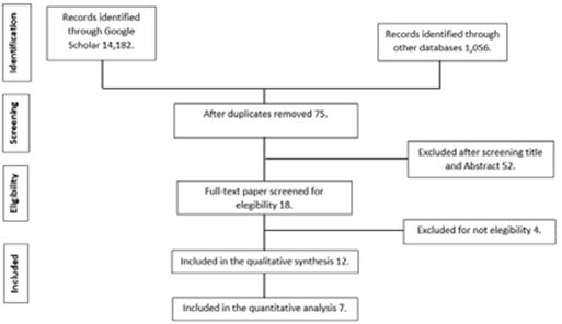 An extensive search of the literature was conducted using the electronic databases in PubMed, Google Scholar, Web of Science, and Science Direct. The keyword strings employed were the following: “Propolis AND periodontal disease”; “Propolis AND red complex”; “Propolis AND periodontal surgery", and "Propolis AND scaling and root planing", finding a total of 15,238 articles relating to the subject. All of the articles included in this review were based on the following criteria: (1) time interval ranging from 2013-2021; (2) randomized clinical trials (ASE), with cohort or cases and controls were considered; (3) patients considered had chronic periodontitis diagnosed with an intraoral examination, with nonadjacent teeth with periodontal bag; (4) propolis management in any presentation; (5) comparison with any other antimicrobial agent, and (6) response, including improvement in clinical and microbiological parameters. Then, the full texts of the possible eligible articles were evaluated considering the following exclusion criteria: (1) patients with gingivitis; (2) in-vitro studies; (3) in-vivo studies (mouse, rat, rabbit, dog, etc.); (4) patients requiring endoperiodontal treatment; and (5) patients with peri-implantation disease. Duplicate revisions were deleted in the different databases; thus, a total of 75 articles were obtained, which were analyzed by title and abstract, their being useful in only 18 bibliographies. Of these, four were discarded due to their failing the eligibility criteria (one on gingivitis, another with a focus on immunodetection, and two on plaque control). In the final analysis, 12 articles were evaluated for qualitative data collection and seven for quantitative data collection (Figure 1).
