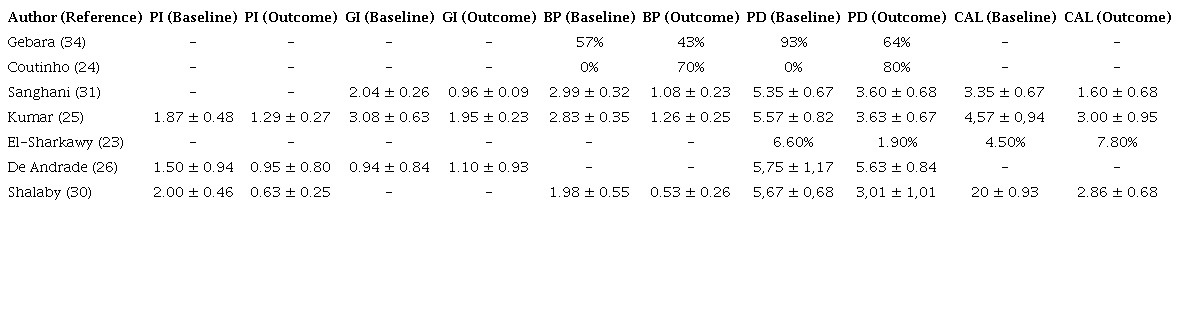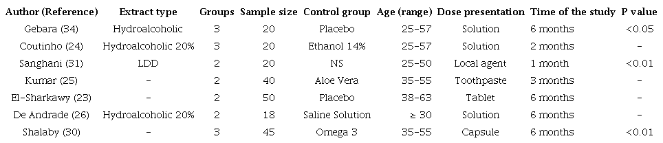 According to the bibliographic review, seven articles related to the use of propolis as an adjuvant of periodontal treatment were compared in study subjects with chronic periodontitis with an approximate age ranging from 25-63 years; the variables are described in Table 1. Some authors describe their methodology by dividing their study population into three groups: a control group; a comparative group, and a group without adjuvant treatment. Gebara et al. considered 20 patients for their study, with three non-adjacent teeth with periodontal pocket. Each of these sites was assigned to a group as follows; group A irrigated with hydroalcoholic extract of propolis twice weekly for 2 weeks; group B irrigated with placebo in the same manner as the first group, and group C, which did not include additional treatment. The analysis of clinical and microbiological parameters was analyzed after 6 months, yielding a promising and more effective result in the group irrigated with propolis (42). Coutinho et al. included the same number of patients with the same characteristics and divided them into the same three groups; analysis of clinical and microbiological parameters was performed after 2 months with positive results in the propolis group (43). Shalaby et al. evaluated 45 subjects with stage II or stage III periodontitis with grade B, who were included in the study, according to the 2017 World Workshop Classification of Periodontal Disease (44). Each subject was randomly assigned to a study group as follows: group 1 with 15 subjects who only received SRP; group 2 with 15 subjects who received SRP accompanied by daily dietary supplementation with omega 3 for 6 months, and group 3 with 15 patients who received SRP with daily propolis supplementation for 6 months. Statistical analysis revealed that both propolis and omega 3 are significant and that they decrease periodontal disease and improve the level of clinical insertion at 6 months (45). Therefore, Shalaby et al. suggest dietary supplementation with propolis or omega 3 as an adjuvant of periodontal therapy (46). Sanghani et al. analyzed 20 patients with a minimum of two deep periodontal pockets. Sites were randomly assigned to the control group who received only SRP, and to the test group who received SRP and propolis. Clinical parameters were evaluated, and subgingival plaque samples were taken on 15 days per month. These results revealed better clinical and microbiological results at sites treated with propolis (47). Kumar et al. also analyzed 40 patients in two groups with CP, separated into group A and group B; the first group used toothpaste with aloe vera, and the second used toothpaste with propolis, with clinical and microbiological parameters by polymerase chain reaction (PCR). At the beginning of the study and at the end of 3 months, the results were statistically significant for propolis both on plaque and in clinical and microbiological parameters (39). El-Sharkawy et al. studied a population with chronic periodontitis and type 2 diabetes mellitus (DM2), for 6 months. The analysis was divided into the placebo group and the propolis group; these patients were administered SRP and a 400-mg tablet according to the group to which they belonged. The results included changes in hemoglobin and in fasting plasma glucose and, as secondary parameters, a decrease in periodontal clinical parameters. The results render it noteworthy that a treatment for 6 months with a daily dose of 400 mg of propolis improves hemoglobin and glucose levels in plasma, as well as improving clinical parameters in chronic periodontitis in this type of patient (48). De Andrade et al. used two groups for the analysis of a 20% propolis hydroalcoholic extract as an adjuvant to periodontal treatment, the two groups denominated the control group and the test group. There were 14 patients in the test group, in whom 65 teeth received SRP and irrigation with propolis extract. In the and finally in the control group, there were 52 teeth that received SRP and a saline irrigation. Clinical parameters were analyzed on days 0, 45, 75, and 90. The results indicated that the use of propolis as an adjuvant of periodontal treatment is more effective than the use of water-saline irrigation, placebo, and omega 3 (49). The clinical parameters discussed in the previously mentioned articles are summarized in Table 2.