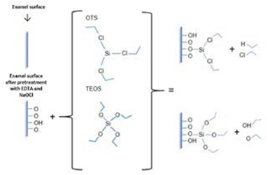 A modification of the hydrophobic surface can involved different methods, of which silanization is an example. The goal is to chemically change the hydrophilic to the hydrophobic condition on the enamel’s surface. To obtain this condition, a pretreatment protocol with EDTA and NaOCl is necessary for exposed collagens fibers and hydroxyapatite film (HA) for the silanization protocol (10). This strategy is employed with excellent results in dentistry, and in the textile, electronics, telephonic, construction, and in the food industries (11,12,13).