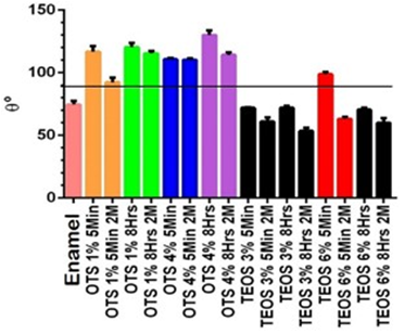 Figure 2 presents the averages of the CA measurement. Under a black bar, samples presenting less than 90 degrees are considered hydrophilic surface, and above the bar, we find all silanized specimens with a CA of more than 90 degrees are a hydrophobic surface. Specimens coated with 4% OTS for 8h, exhibited the highest average CA measurement (>130°), while those silanized with 3% TEOS for 5 min had the lowest average CA (<75°).