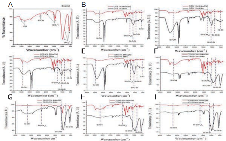 In Figure 3, a control (enamel) presents characteristic bonds (3,200 cm-1) of the elements in hydroxyapatite (P-OH, OH). These bonds are indispensable in the silanization process. In silanized groups, there are present the characteristic bands of Si-OH (3,200 cm-1) and Si-O-Si (1,500-750cm-1), in contrast with the CA frequency of Si-O-Si and Si-OH bands. The samples expressed that certain elements can be variable depending on the percentage of silica on the modified surface.