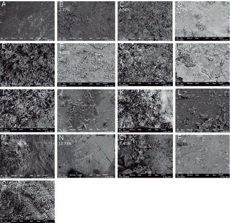 In the SEM analysis, Figure 4A represents enamel without silanization. Images 4B-4Q represent all groups silanized with OTS and TEOS. In each image, a Si percentage was determined with EDX analysis.
