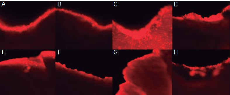 In the microphotographs (Figure 6) of OTS and TEOS coating with Rhodamine, the silanizing agents are observed as red in color on the surface of the dental enamel. This indirect marking allows us to observe the homogeneity and continuity of the silanizing coating, as well as whether it possesses fractures or partial or total loss of the coating after remain in the citric acid.