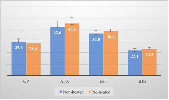 Although preheated composite resins exhibit an increased degree of transformation, light curing is not immediately applied because clinically, the material must be placed in the cavity and formed. During this process, preheated composites cool down, and their properties change accordingly. Daronch et al. (41) found that the surface temperature of composite resins decreased by 35-40% at 40 seconds after preheating to 60°C. In another study, researchers stated that after 45 seconds, the average temperature drop varied between 5.2°C and 8.7°C (18). In this study, the temperature of the composite during placement was not recorded. However, a more important issue is that the reduced viscosity of the preheated composite materials provides better adaptation to the cavity walls.