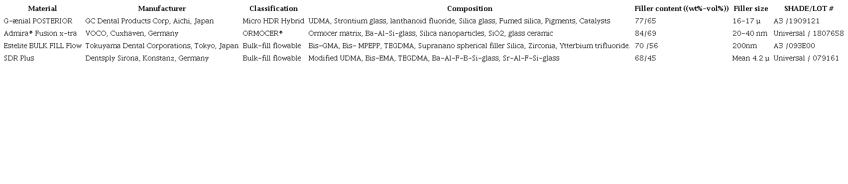 Three commercial bulk-fill resin-based composite materials and one microhybrid resin- based composite were evaluated in this study. Admira® Fusion x-tra (AFX) is an ormocer-based, high viscosity, bulk-fill composite resin; SDR Plus (SDR) and Estelite Bulk Fill Flow (EST) are low viscosity, bulk-fill resin composites; G-ænial Posterior (GP) is a urethane dimethacrylate- based microhybrid composite. The manufacturer information and properties of the composite resin materials used in the study are shown in Table 1.