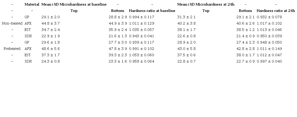 A descriptive analysis of the VHN values and hardness ratios is summarized in Table 2. This table includes top and bottom surface VHN values, baseline and 24-hour measurements, and hardness ratios of all groups. In addition, the mean and standard deviations of nonheated and preheated VHN values are presented in Figure 1. VHN values of the preheated and nonheated groups showed statistically significant differences in all groups (p<0.001). While microhardness increased after the preheating procedure in AFX, EST, and SDR, the VHN values decreased in GP.