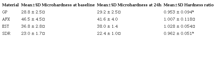 The mean and standard deviations of the hardness ratios are presented in Table 3. AFX and EST showed the highest ratios, while there was no statistically significant difference between AFX and EST (p>0.001). Further, there was no statistically significant difference between GP and SDR (p< 0.001).