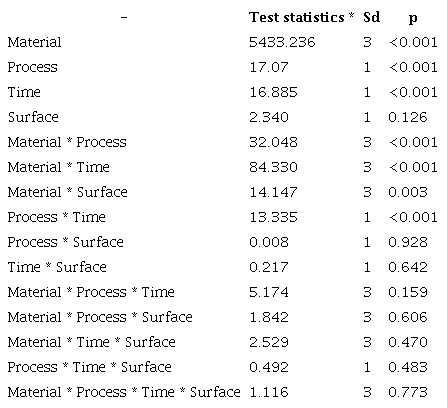 The data were analyzed using the IBM SPSS V23 software. The normal distribution compliance was examined through the Shapiro Wilk test. The generalized linear model method was used to examine the effects of material, process, surface, and time main effects and interactions on microhardness values. Further, the Duncan test was used for multiple comparisons. The analysis results are presented as mean and standard deviation for quantitative data. The level of significance was taken as p<0.05.