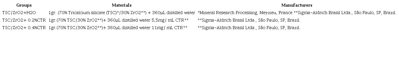 The materials were divided into 3 experimental groups (Table 1). The materials were manipulated in the proportion of 1 g of powder/360 µL of liquid (distilled water or CTR in water solution -5,5mg/ mL ou 11mg/mL).