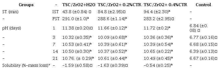 The results of the properties are presented in Table 2. TSC/ZrO2+CTR in the two concentrations showed higher IST values than those of TSC/ ZrO2+H2O (P<.05). TSC/ZrO2+CTR 0.4% showed the lowest FST values (p<0.05). After 1 day TSC/ ZrO2+H2O demonstrated lower pH values than the associations with CTR (p<0.05). In the other time intervals, TSC/ZrO2 and associations promoted similar alkalization (p>0.05). TSC/ZrO2+CTR 0.4% presented lower gain in mass than the other materials (p<0.05).
